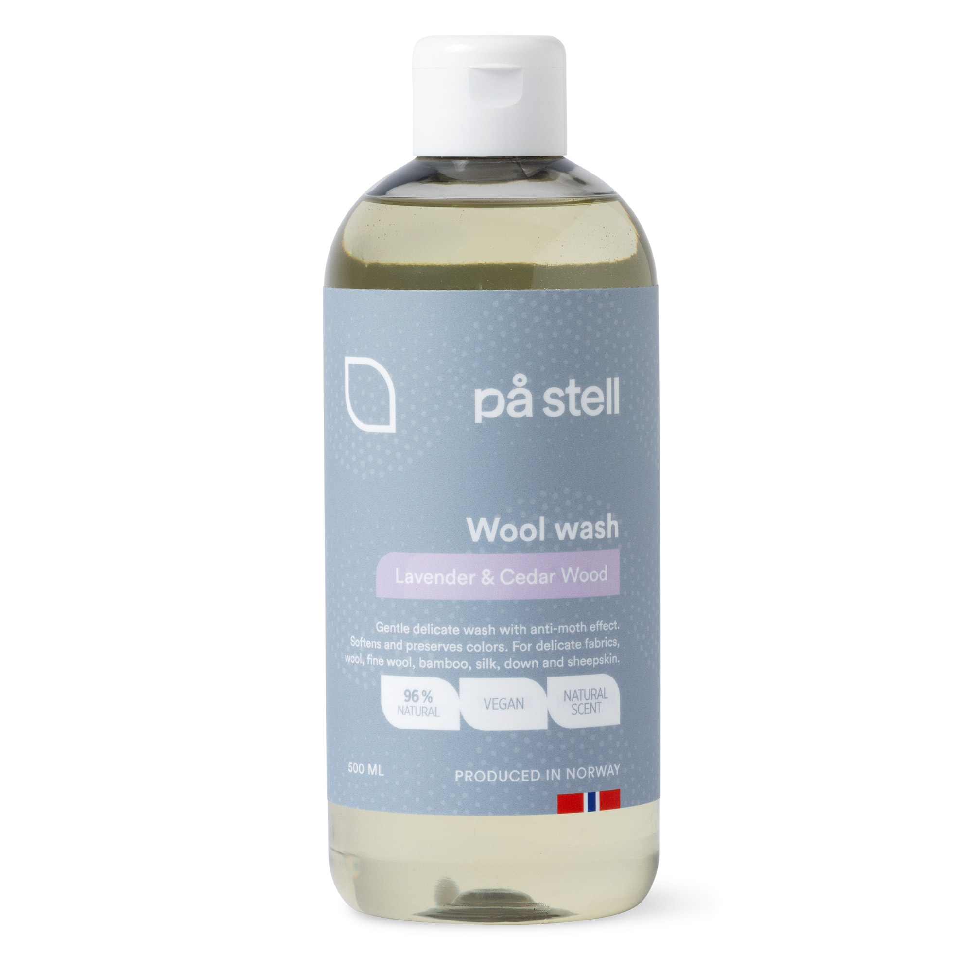 På Stell Wool Detergent is made from natural oils. It is effective and naturally softening. The detergent is gentle, cleans at low temperatures, and is especially suitable for wool, bamboo, cashmere, alpaca, mohair, silk, and down.