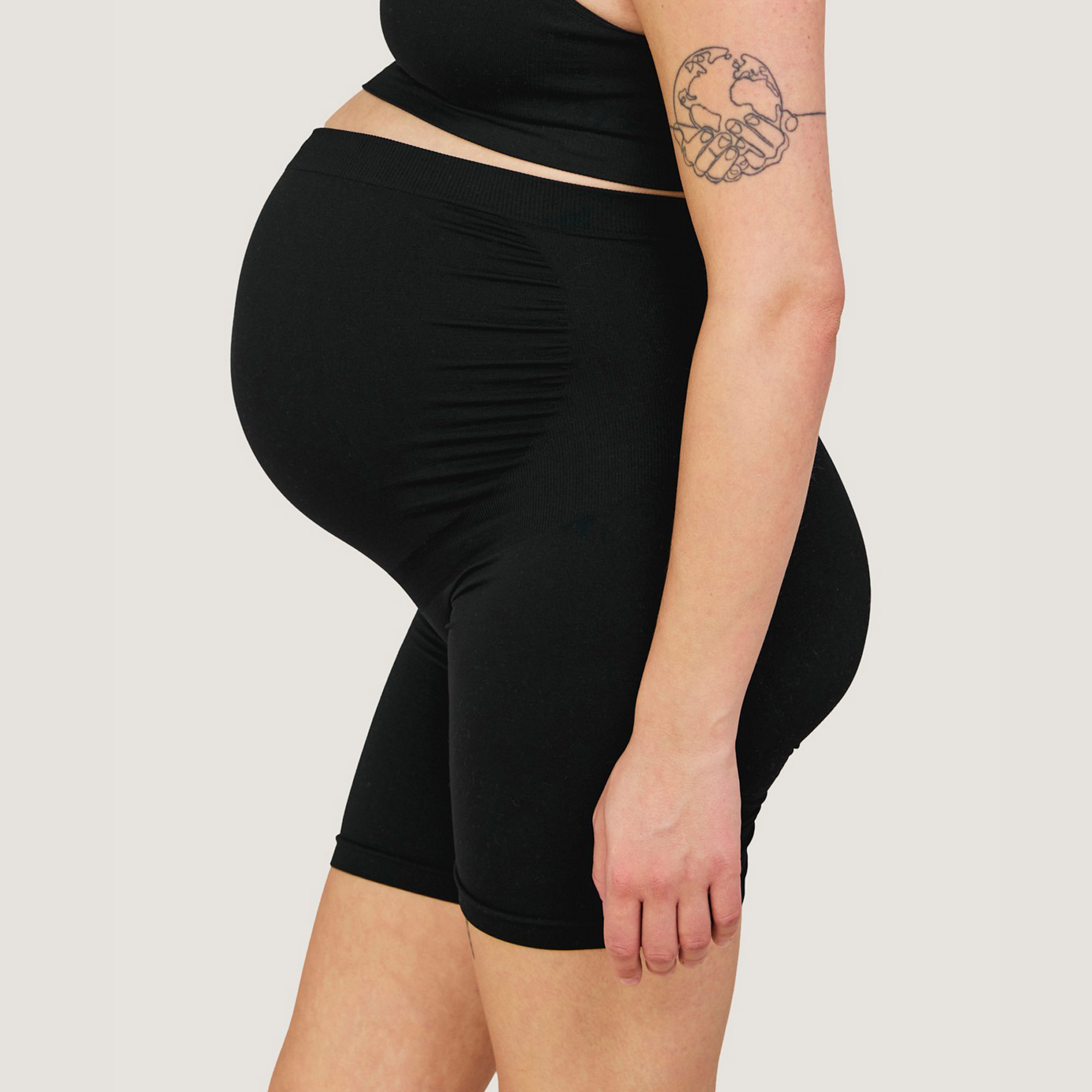 Mjuka och stretchiga mammashorts från Carriwell, designade för att ge stöd och lyft under magen samtidigt som de följsamt anpassar sig efter den växande gravidmagen. Den sömlösa designen runt mage och rygg ger en smidig känsla utan skav – perfekt för känslig hud.