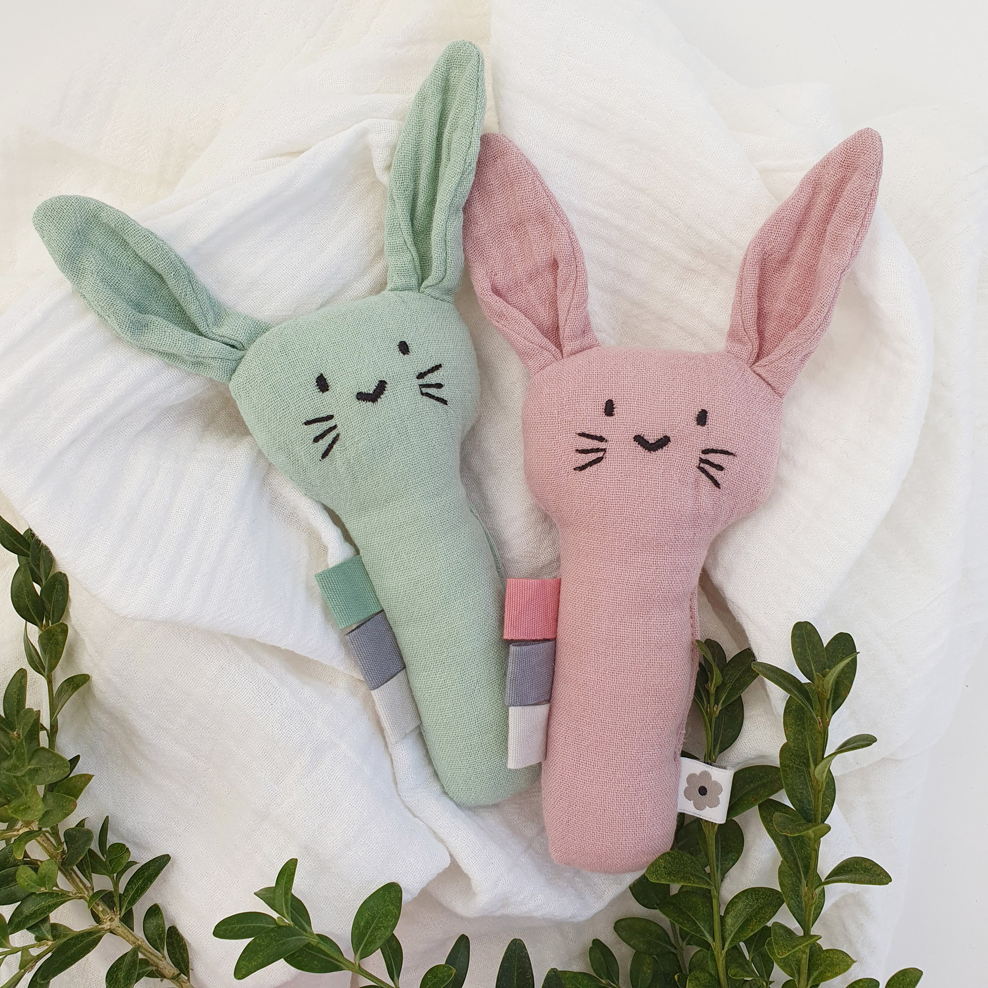 Skallror för de minsta barnen i ekologisk bomull, trä och silikon